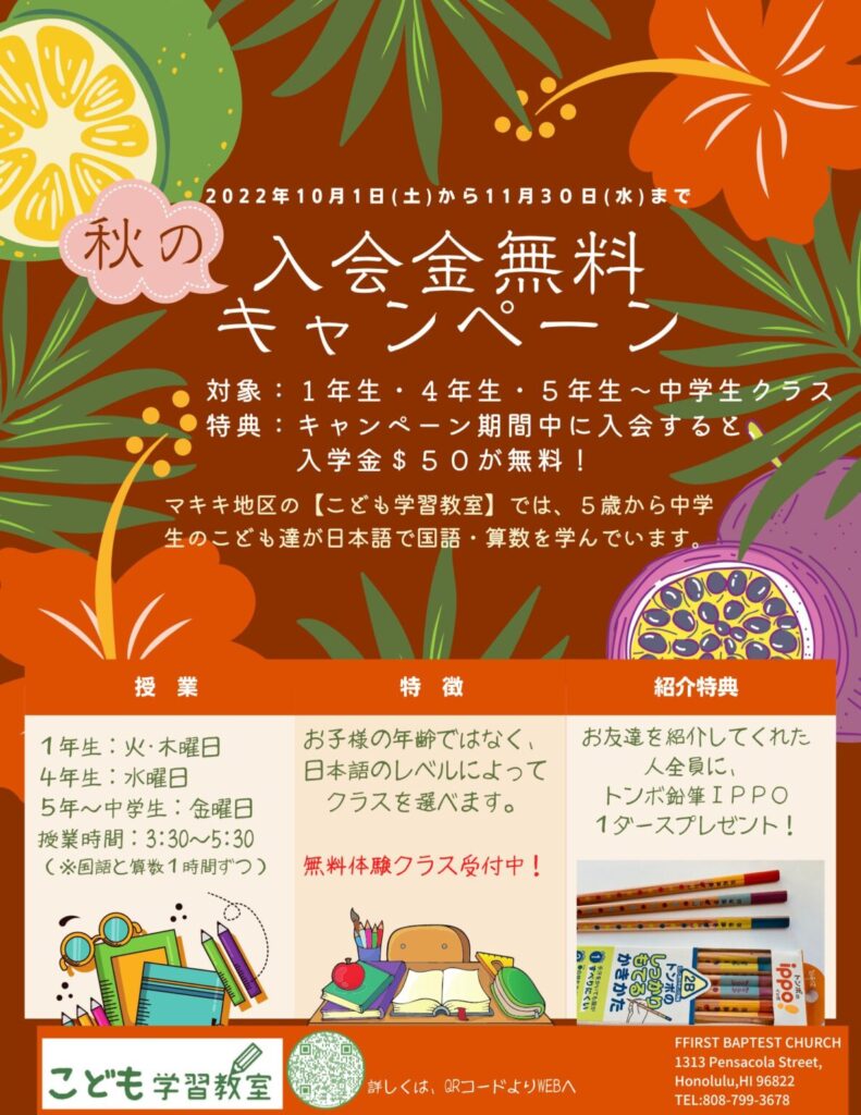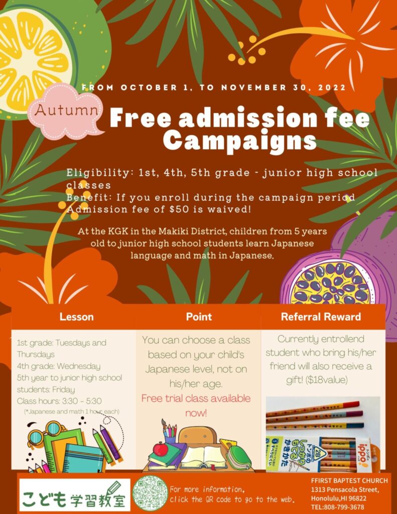 Kodomo Gakushu Kyoshitsu will start an “Autumn Enrollment Fee Free Campaign” on October 1.