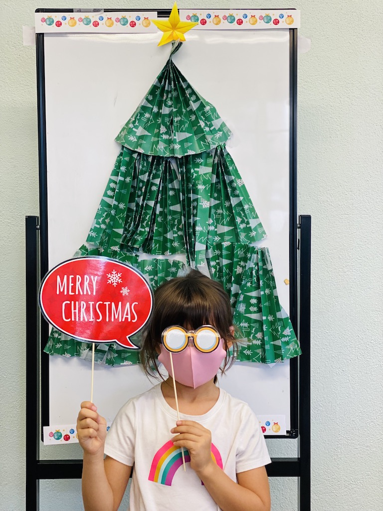 お楽しみ会最初のイベントは、それぞれクリスマス・プロップスを手にして皆揃って記念撮影しました。