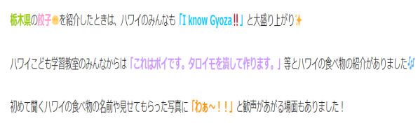 ★コツコツ覚えた自己紹介とハワイの食べ物の発表でしたが、みんな自信を持って発表し、とても楽しい交流の時間を持つことができました。