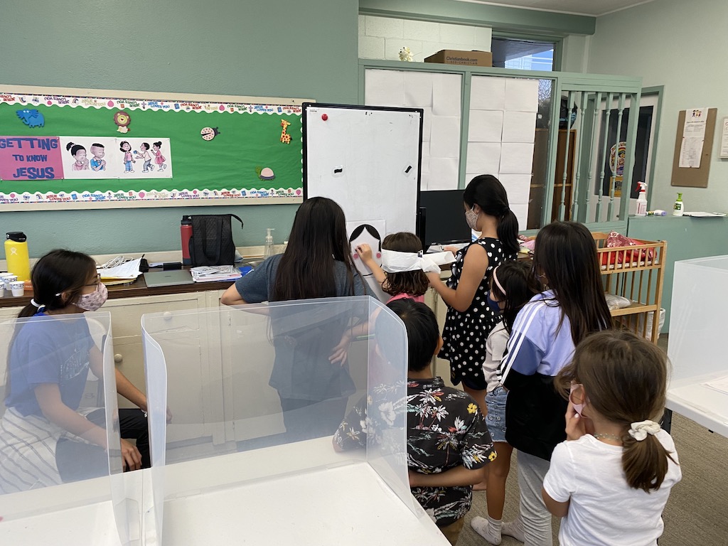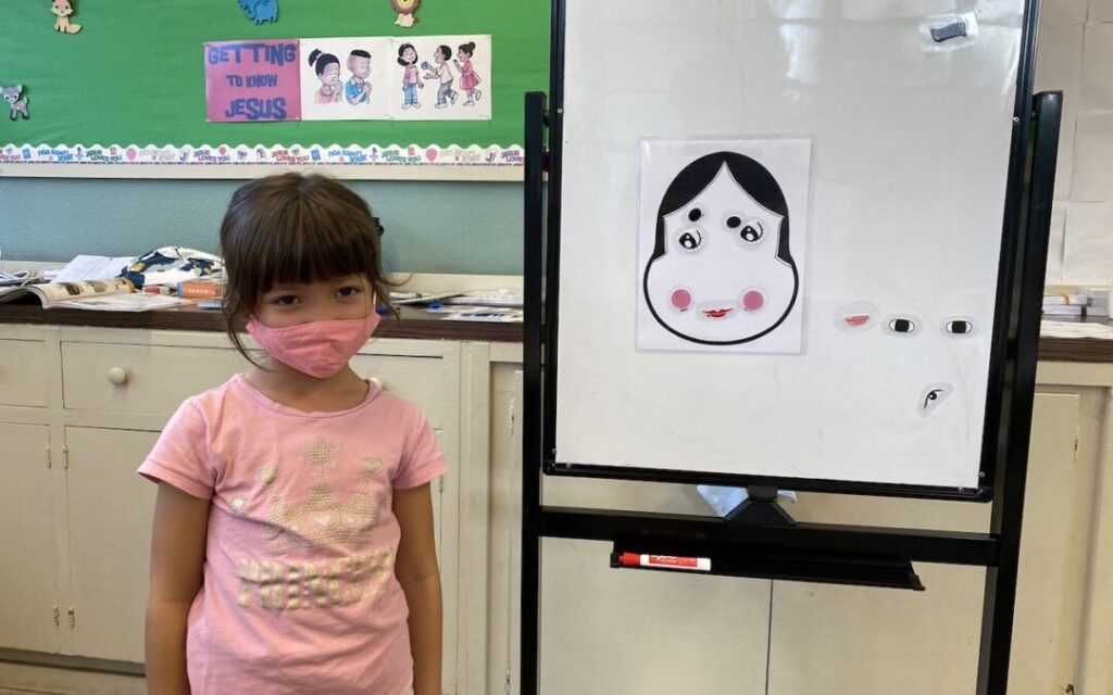 「先生、目隠ししたら、見えないよ。」と一言。次の瞬間、生徒皆が前に集まってきてくれて一生懸命「上」「下」「righ(右t」など積極的に見えない私に教えてくれました。目隠ししている私にパーツを渡してくれるAちゃん、そして、皆ありがとう。目隠しをしていながらもいえいえ、きっと目隠ししていたからこそ生徒たちのワクワクを心で感じる事が出来ました。とても楽しかったです。そして、感動しました。