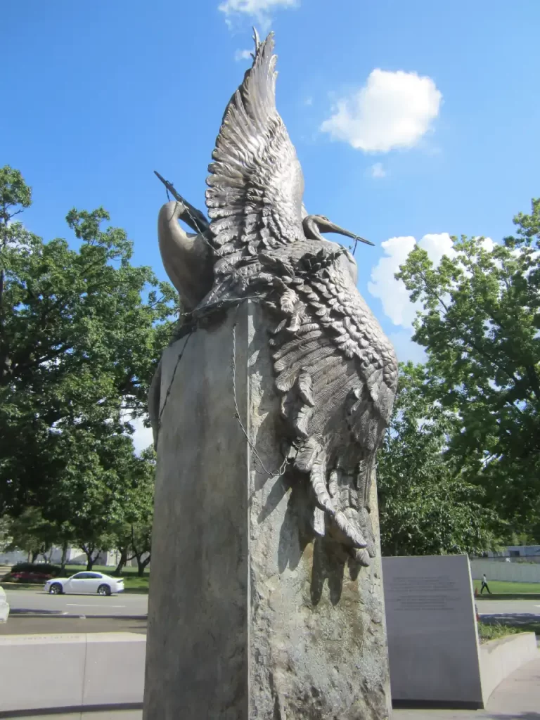 その後、国立日系米国人記念碑を訪問しました。第二次世界大戦に日本人を祖先に持つということだけで、抑留キャンプに収容された日系人の歴史を忘れないために建立されたもので、鶴が有刺鉄線に巻かれて身動きが取れなくなっている姿の銅像が公園の中心にありました。ハワイでは、日系人コミュニティーがかなり大きく、全ての日系人を収容できる施設がなく、また、社会に混乱をきたす恐れがあったため、抑留施設に収容されたのはごく一部の日系人でしたが、米本土の日系人は殆ど全てが強制的に抑留キャンプに収容されました。